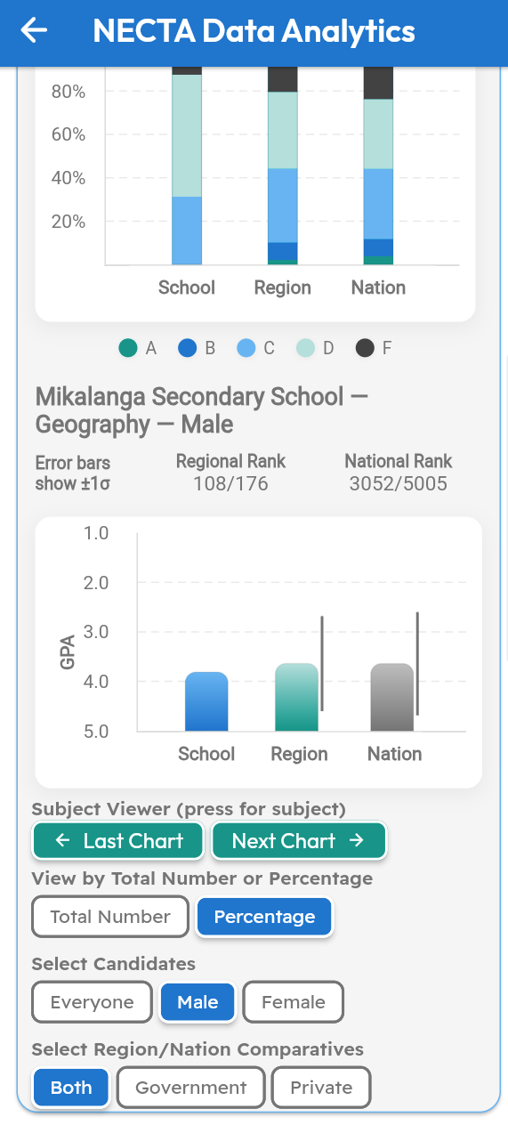 NECTA exam result analytics by school, region, and nation. Sort by time, by gender, by ownership, by subject, and by combo (A-level).